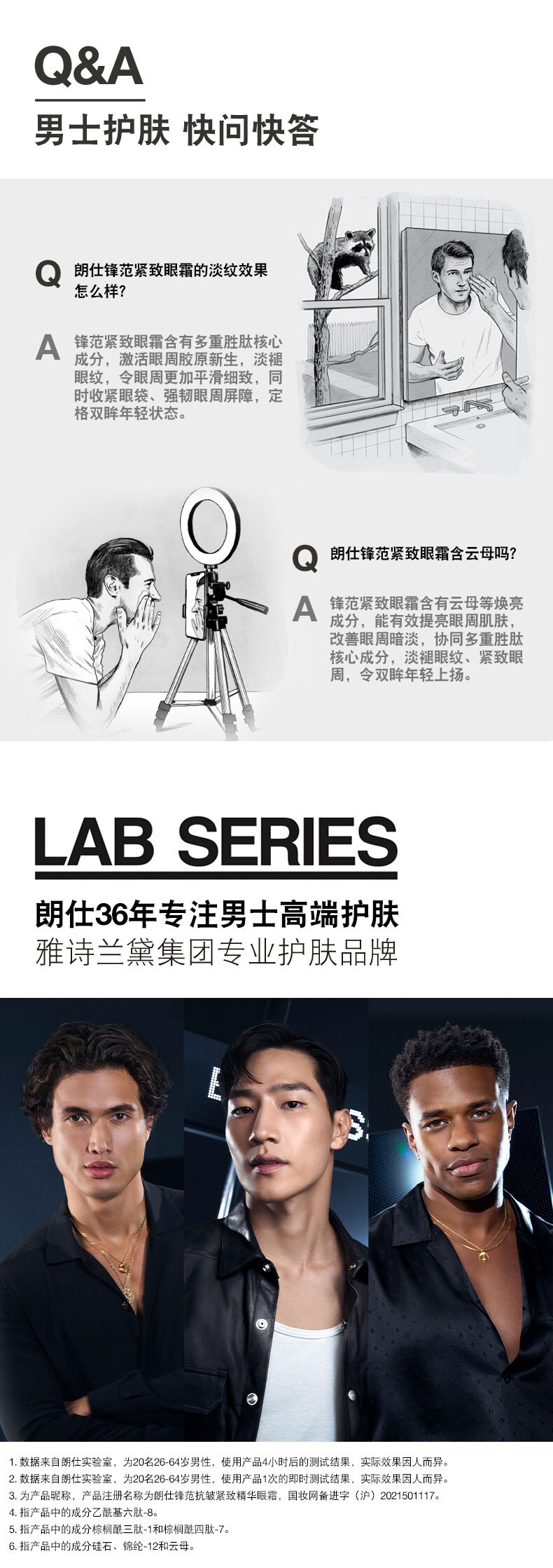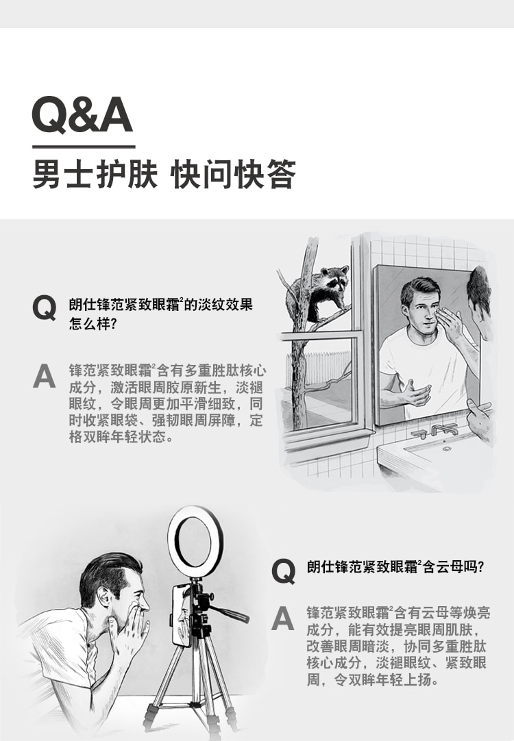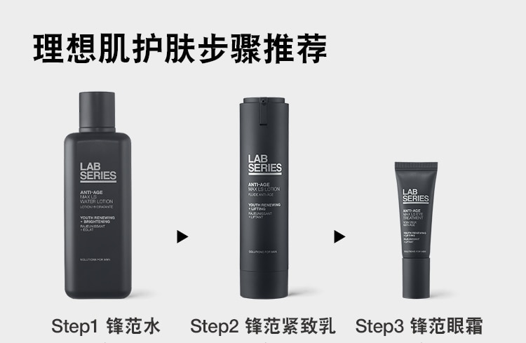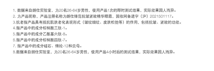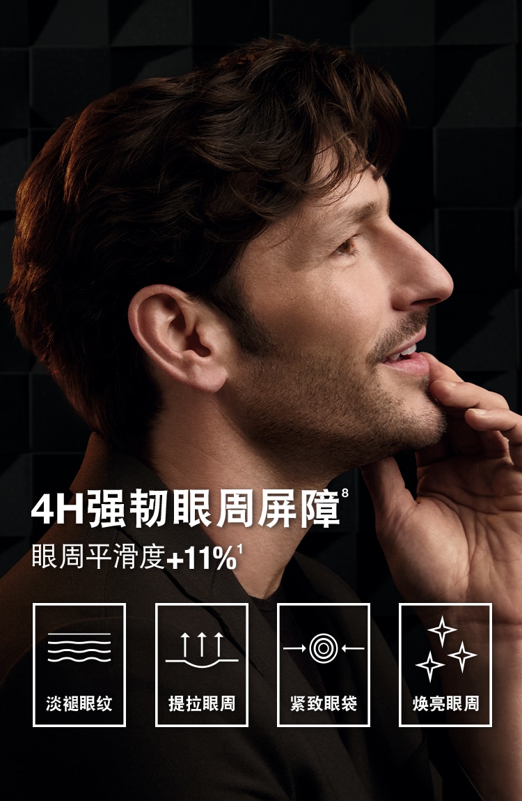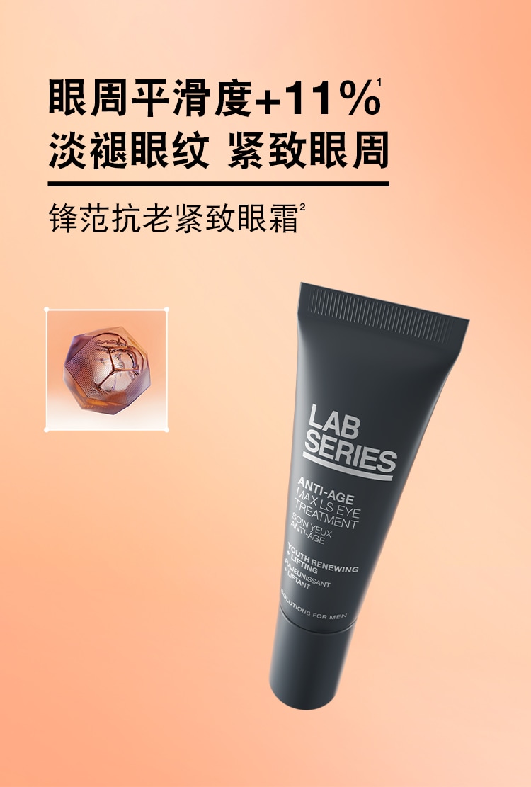 首页 / specialty care 朗仕锋范抗皱紧致精华眼霜ANTI-AGE MAX LS EYE TRMN 新添加POWERV抗皱紧致复合物,滋润并提升修护力,助力皮肤胶原蛋白自动生成,令眼周肌肤重现精睿神采。 加载中 锋范紧致系列 紧致提拉眼部下方和眉部肌肤,展现肌肤年轻焕亮光彩 眼周平滑度 +11% 修护眼周肌肤,淡退眼周细纹、干纹 激活胶原新生,眼周肌肤更显年轻**朗仕对 28位44-60岁的男性使用产品后立即进行了临床测试。产品功效因人而异。 实验室结果 88%88%男士认可,紧致眼周肌肤****107位男性每日使用两次产品,4周后进行消费者测试88%88%男士认可,提亮眼周,改善暗沉****107位男性每日使用两次产品,4周后进行消费者测试"92%92%男士认可,保湿滋润眼周肌肤****107位男性每日使用两次产品,4周后进行消费者测试 成分配方焕活再生科技,密集保湿,提升细胞再生力,令肌肤重焕光彩,淡褪细纹、干纹。多重胜肽,隐匿肌肤老化痕迹:棕榈酰四肽-7,提升肌肤弹性,提拉紧致。乙酰基六肽-8,激活胶原新生,抚平干纹细纹。水解大米提取物和透明质酸钠,为肌肤补充水分,保湿滋润。多重焕亮成分,为肌肤注入活力,即刻焕亮眼周肌肤。